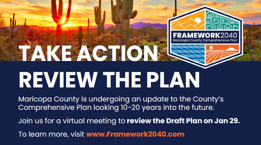 Maricopa County in Arizona has released the Framework 2040 Comprehensive Plan Public Review Draft. The draft outlines a vision for the county's future looking 10 to 20 years ahead. A virtual meeting to preview the plan is scheduled for Thursday, January 29, 2026, at 5 PM. Participants can find meeting details and view the draft plan by visiting www.Framework2040.com.
